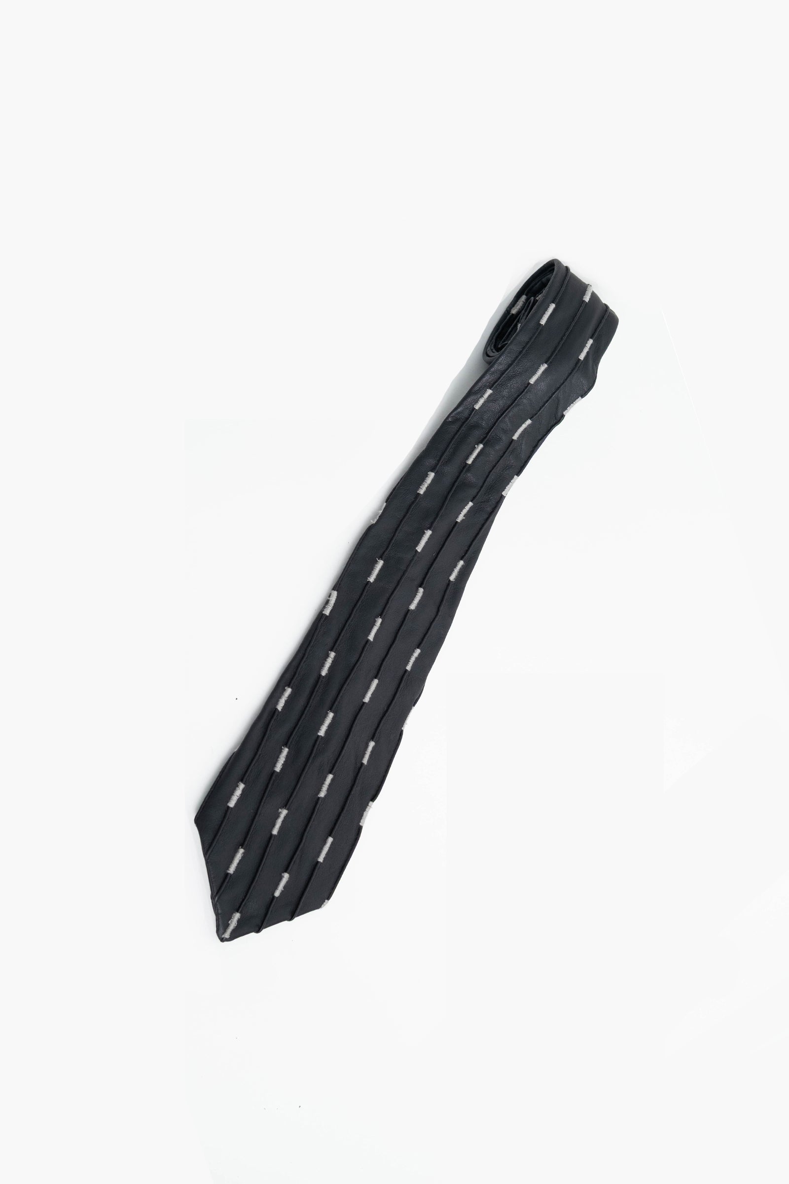 Details: Crafted from discarded leather scraps, this tie features intricate pintucks and embroidery