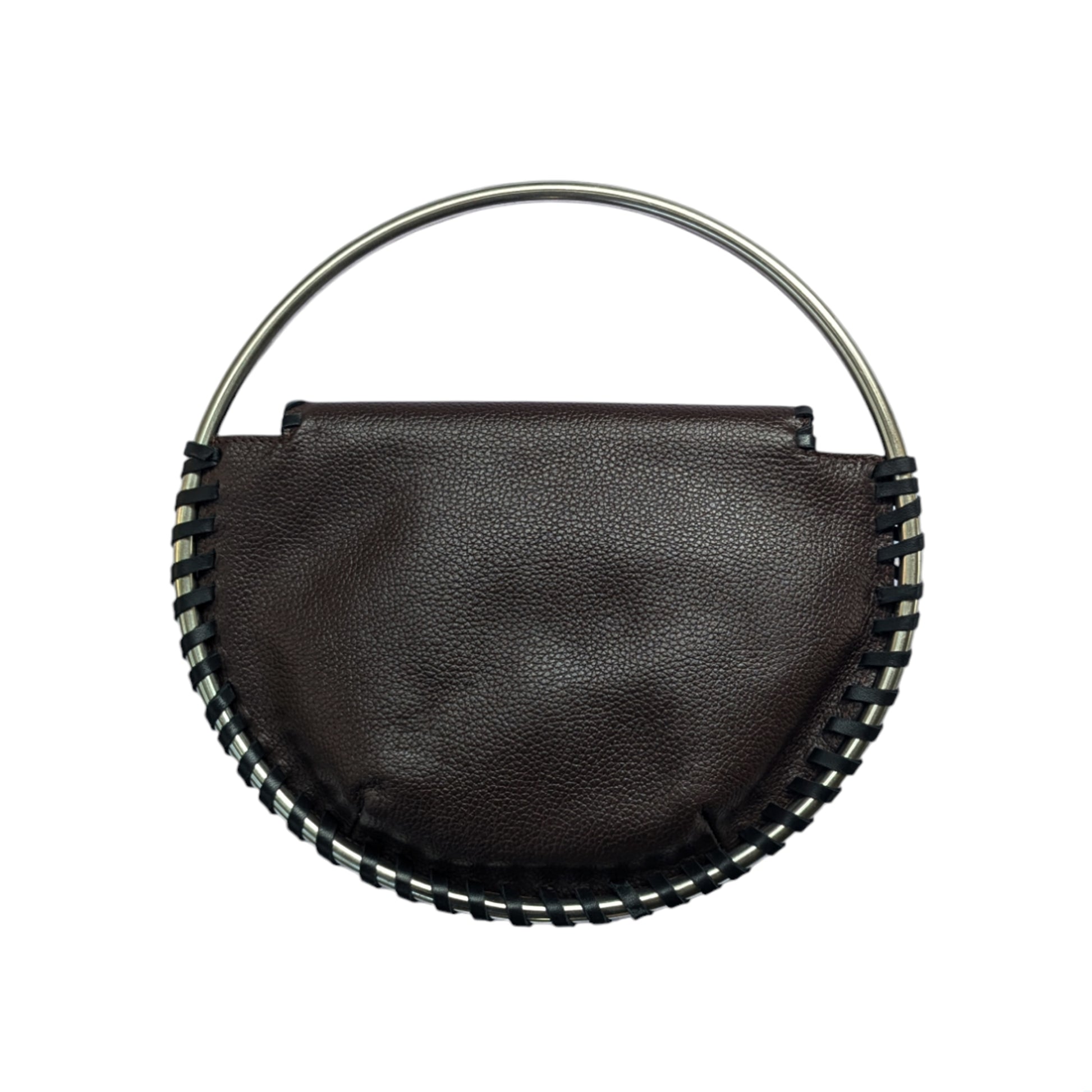 Details: The bag features a bold circular stainless steel frame, hand-stitched with premium leather reclaimed from locally sourced scraps in Chennai. Owing to the limited availability of these materials, this piece is produced in very limited numbers.