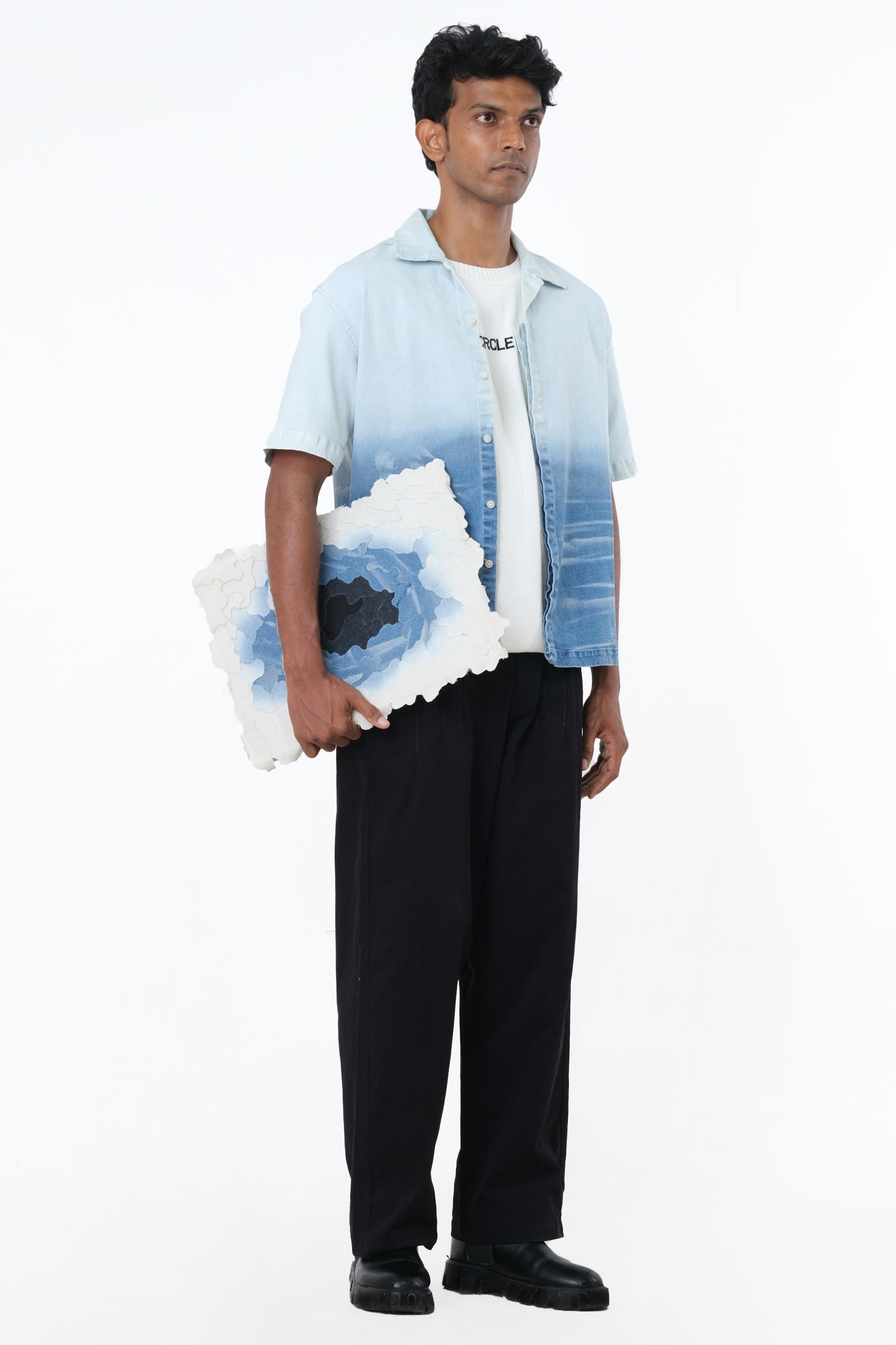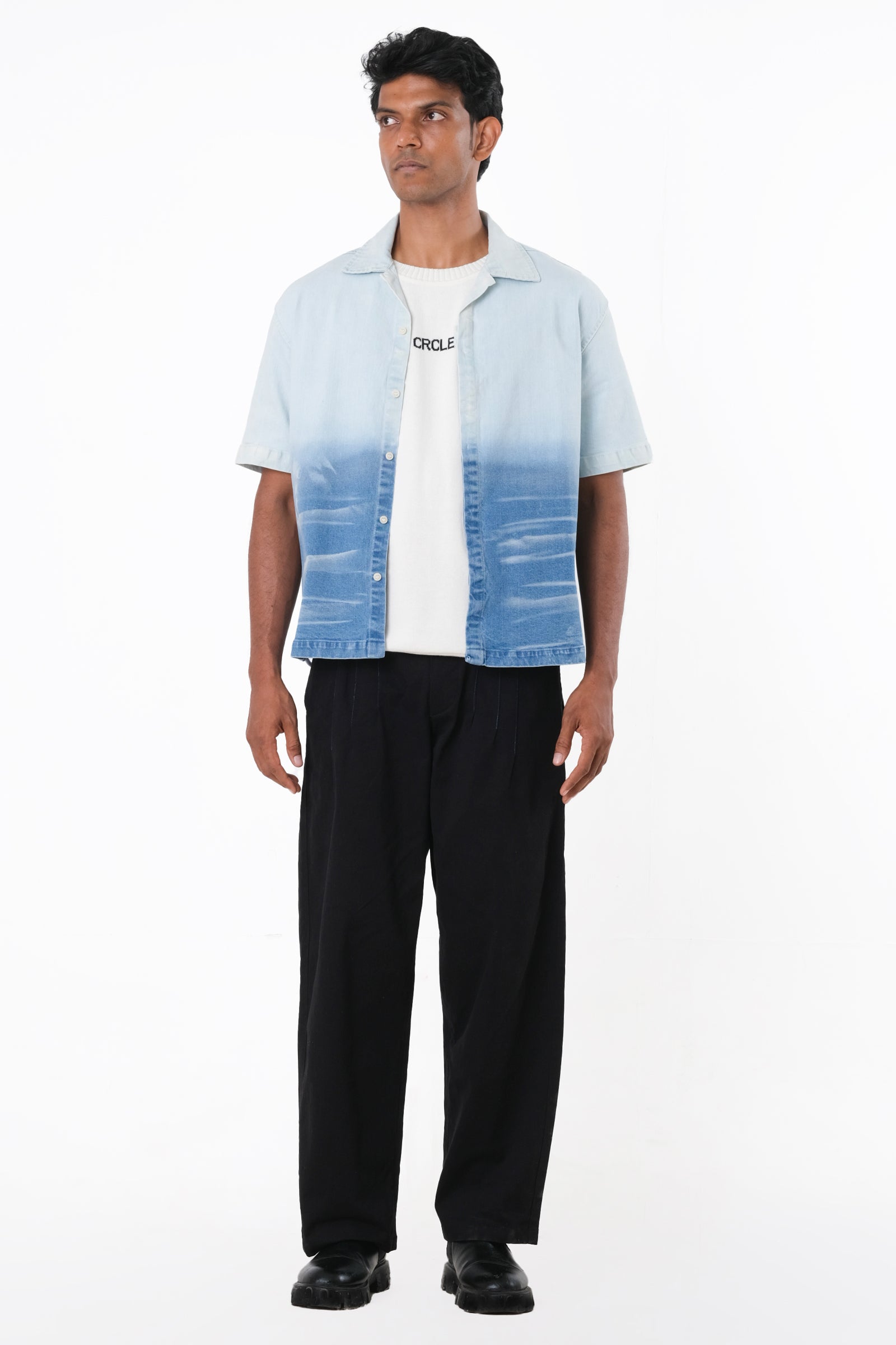 Details: Ombre washed blue denim shirt with water flow line wash effect. Side panels, corozo buttons and rope detail at the bottom.