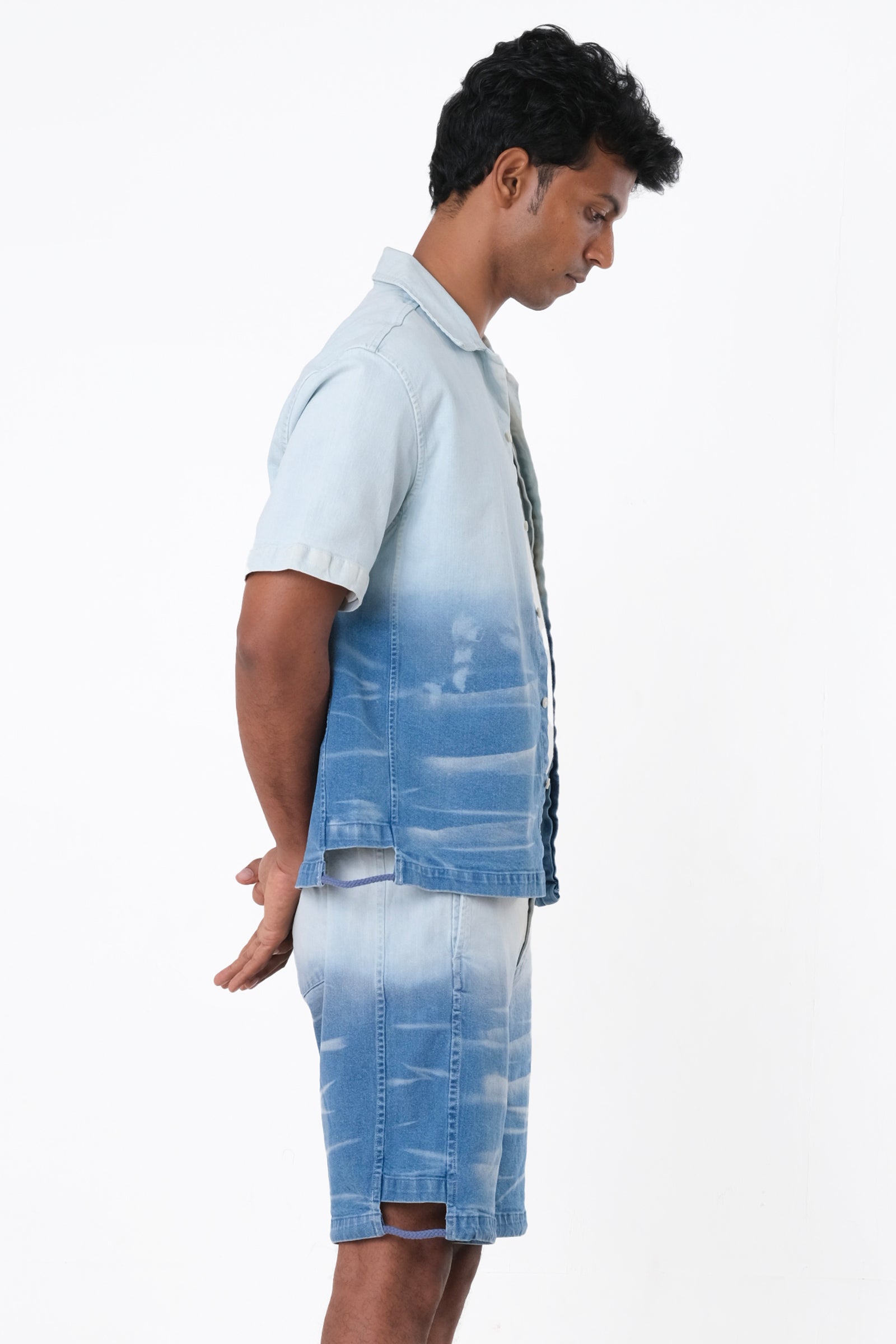 Details: Ombre washed blue denim shorts with water flow line wash effect. Side panels and rope detail at the bottom. Functional pockets at the side and patch pockets at the back.