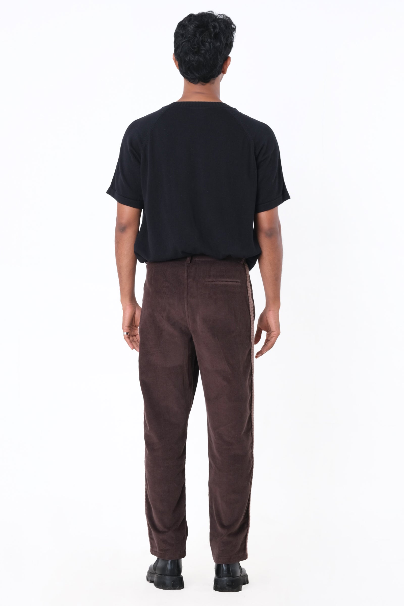Details: Corduroy pants made with 100% organic cotton with hand done crochet tapes and pockets on both sides and a welt pocket at the back.